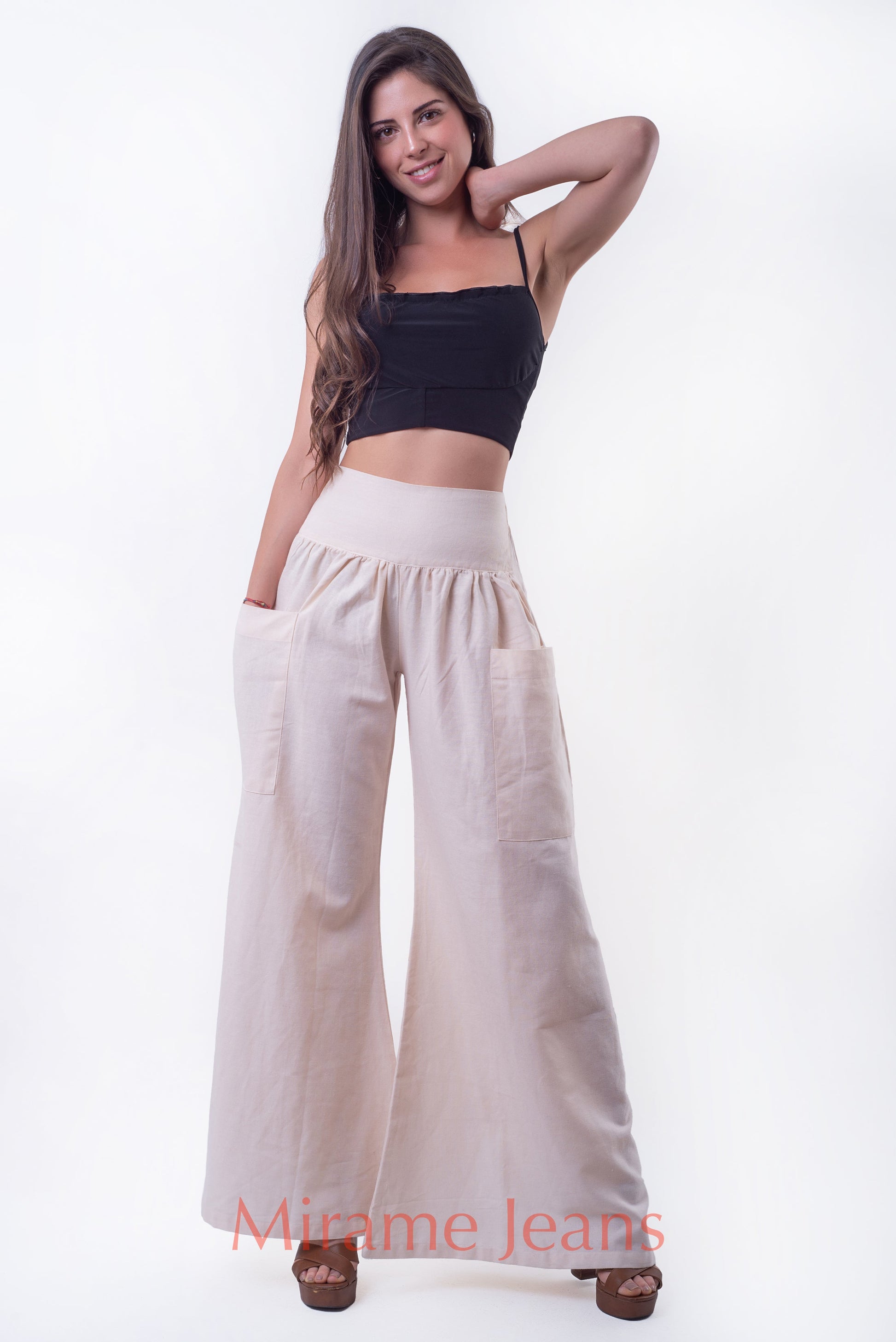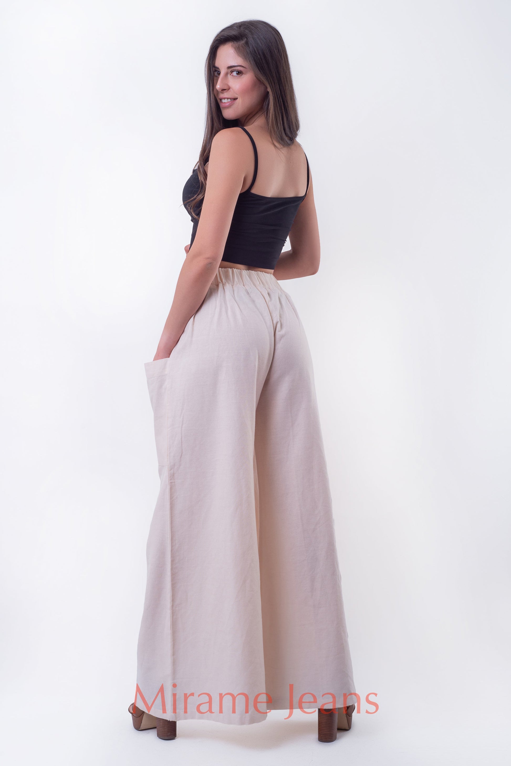 Pantalon Palazzo Lino, tela rigida, pretina ancha elasticada La modelo usa talla S.