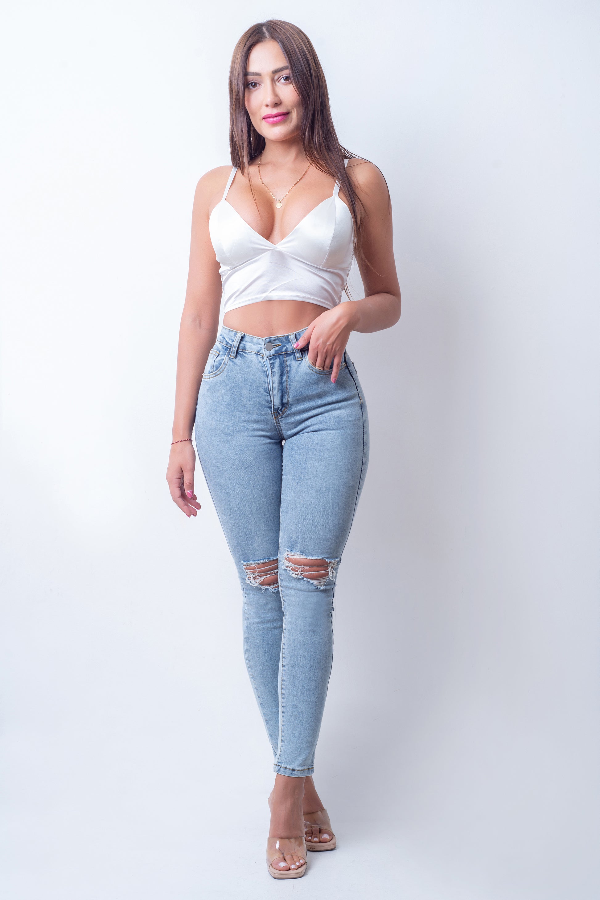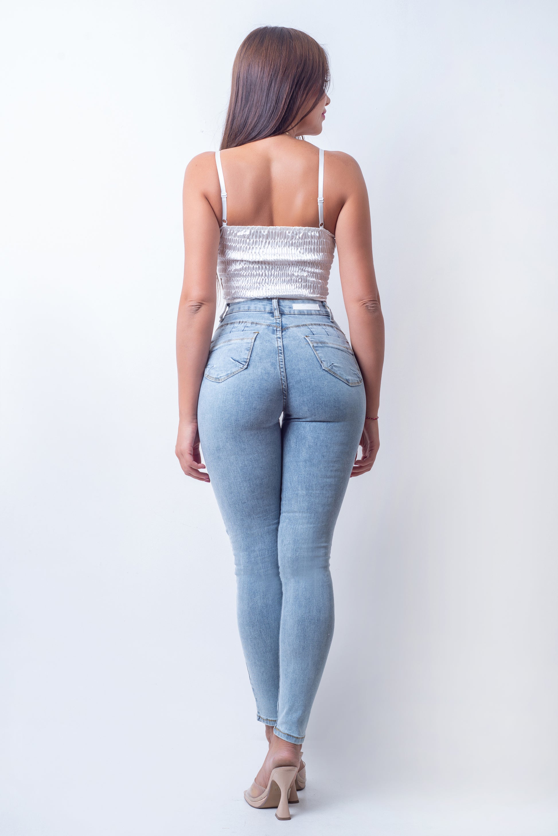 Pitillo beige, elasticado, tiro alto, push up. La modelo usa talla 38 y mide 1.65 cm