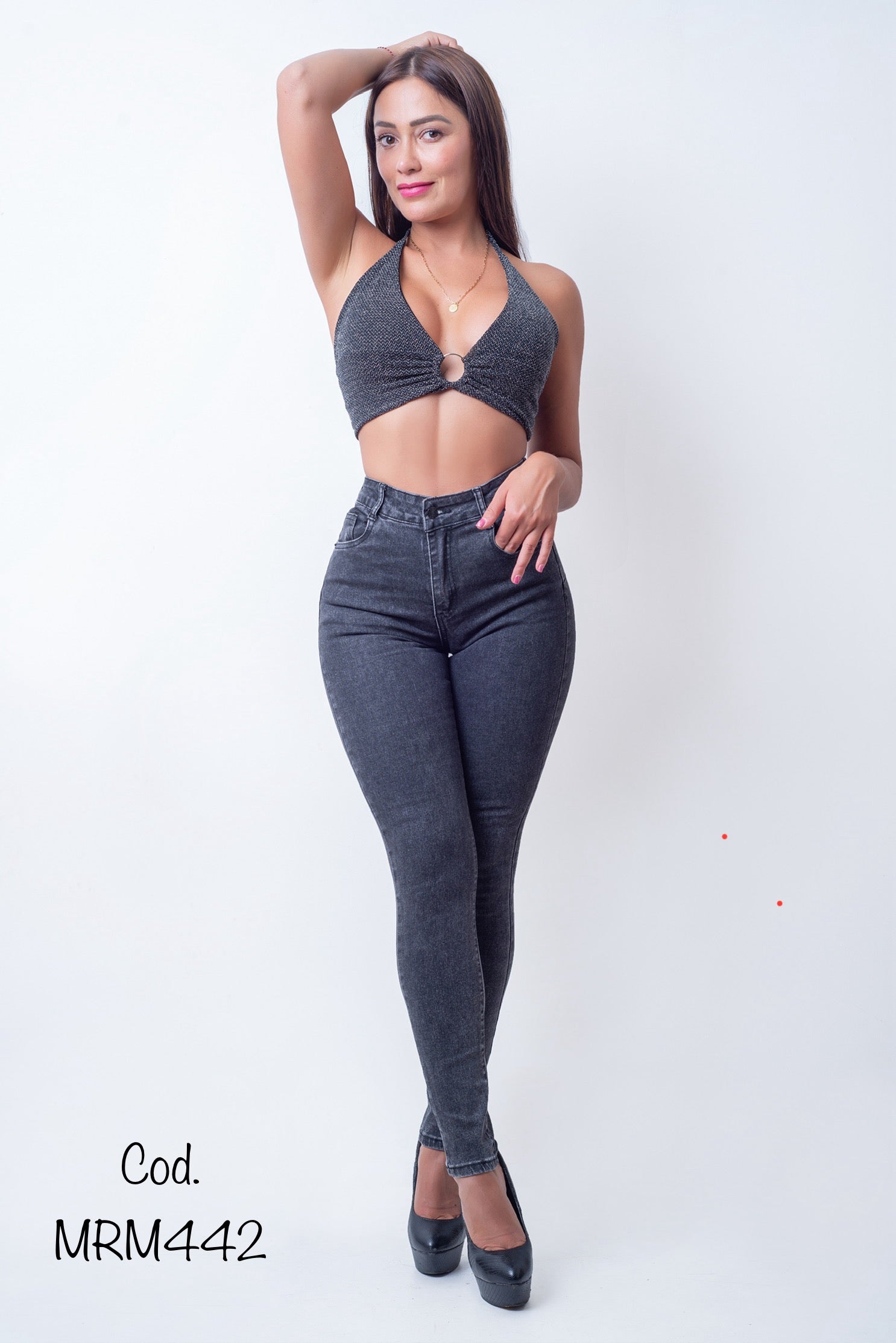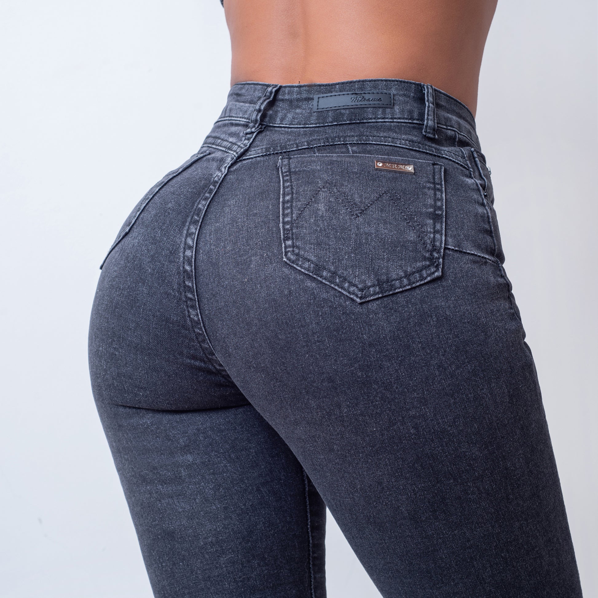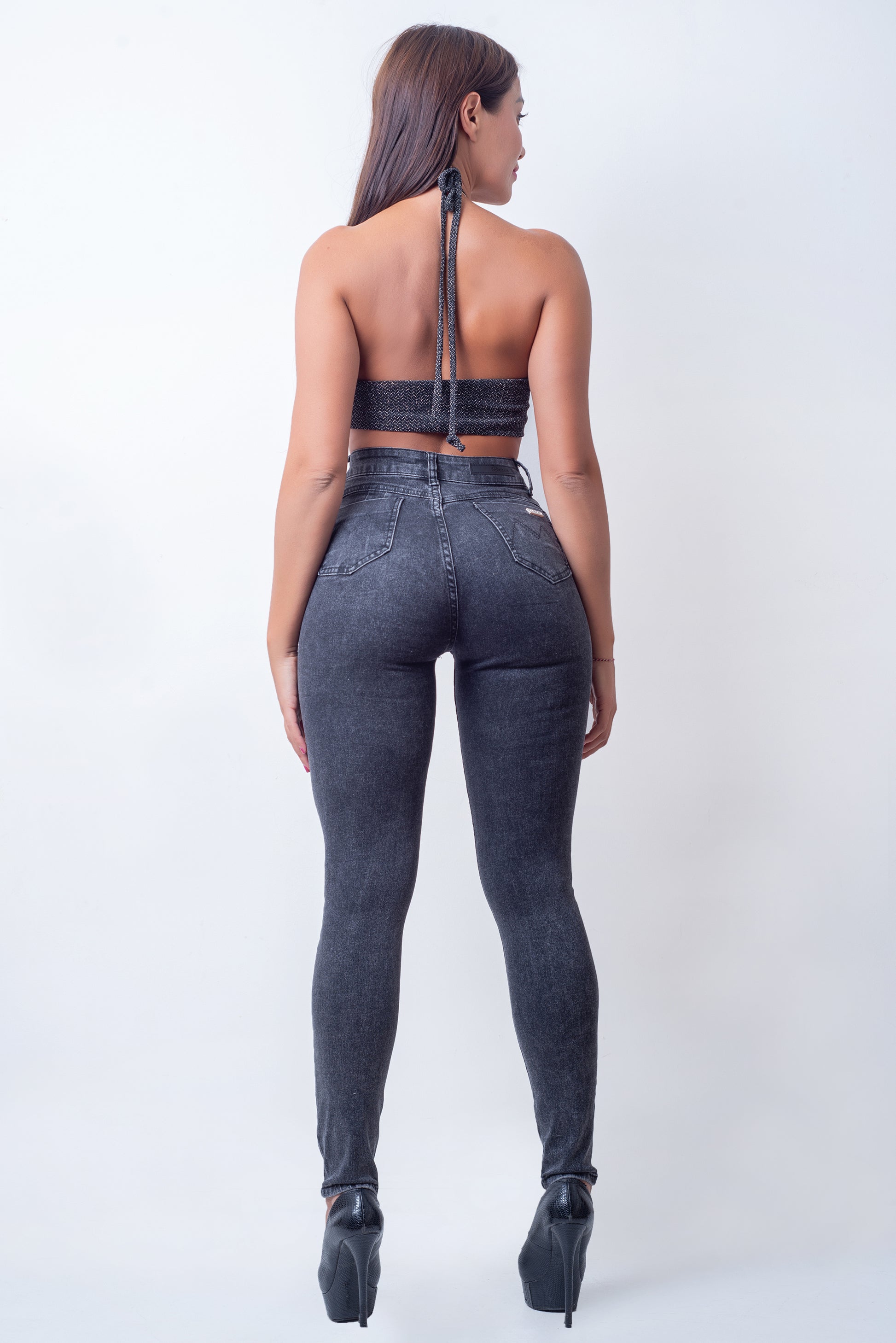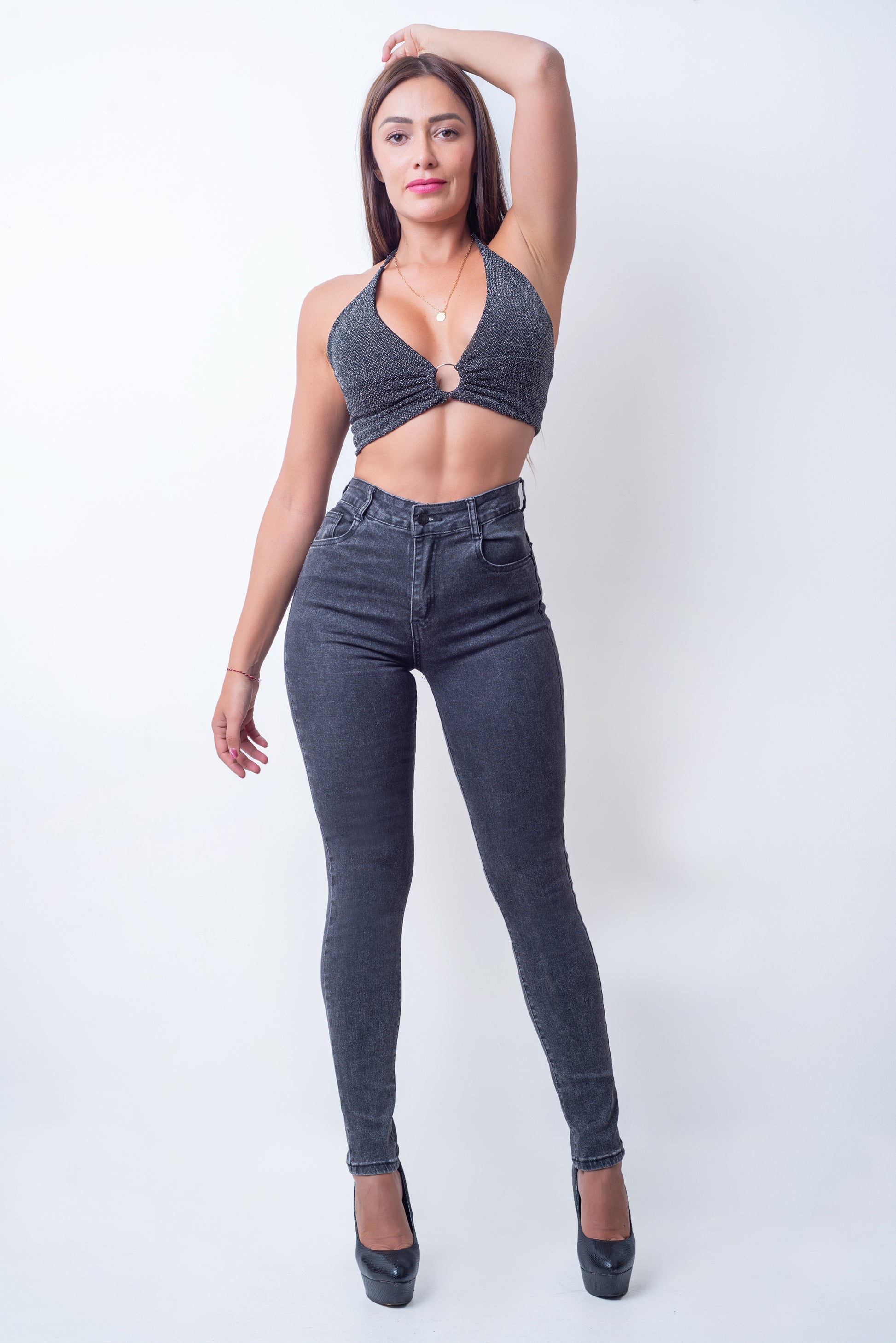 Pitillo , elasticado, tiro alto, push up. La modelo usa talla 38 y mide 1.65 cm