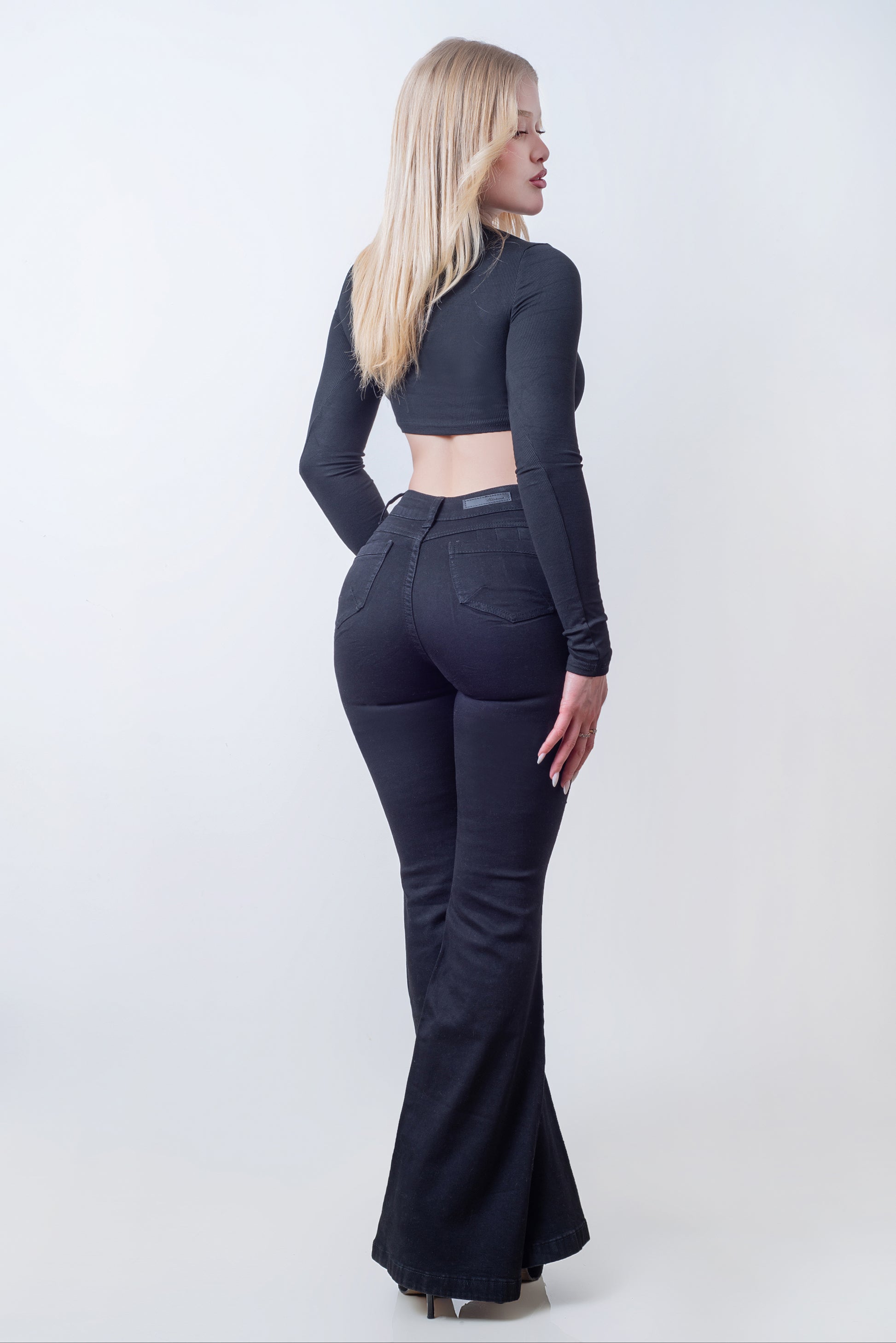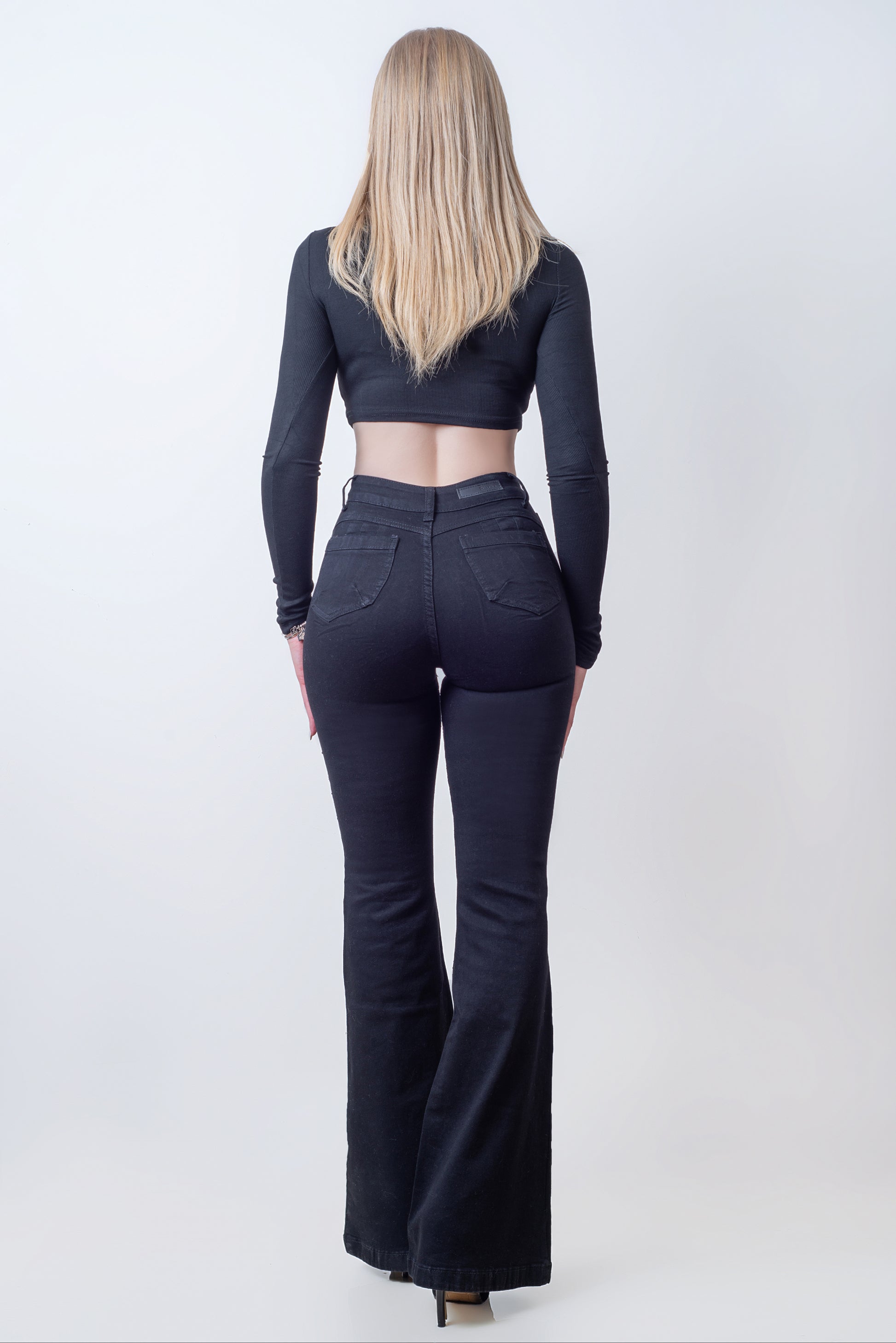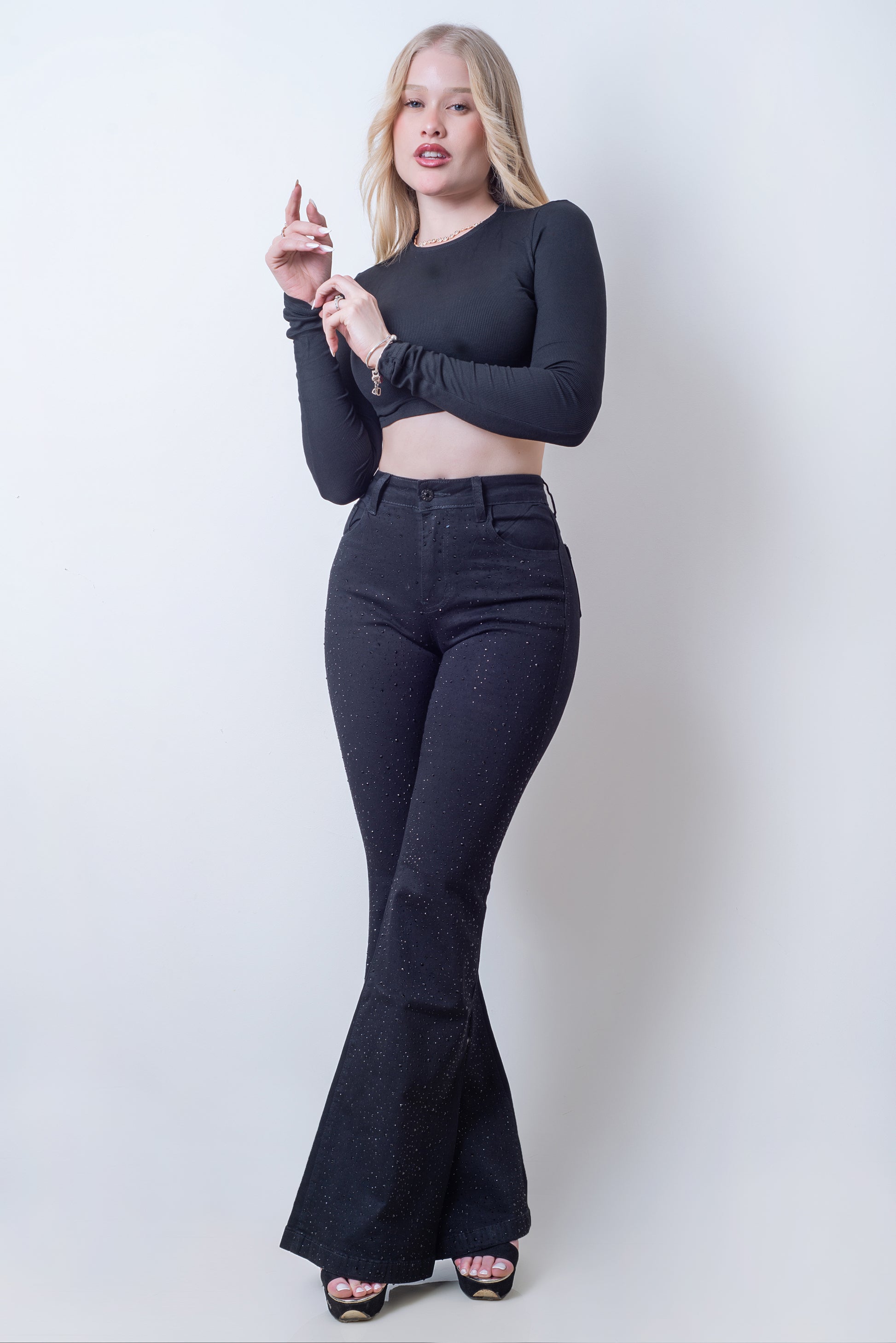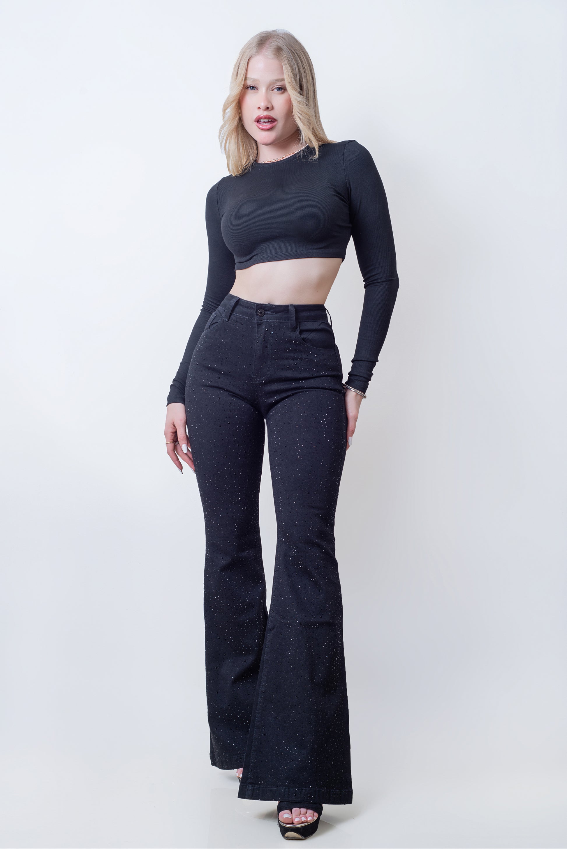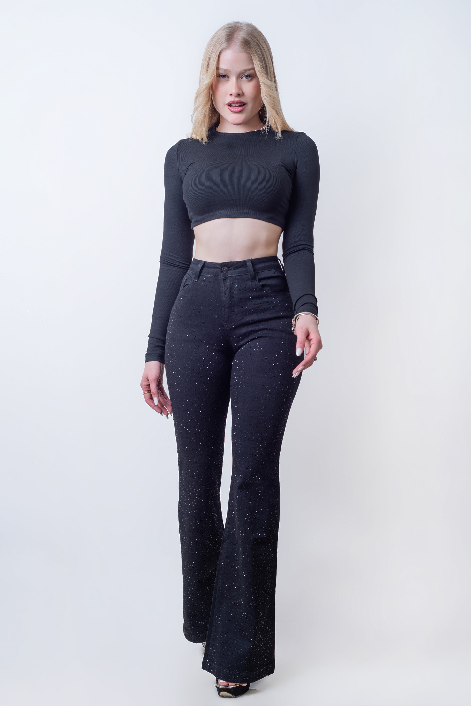 Jeans flare con brillo elasticado. La modelo usa talla 38