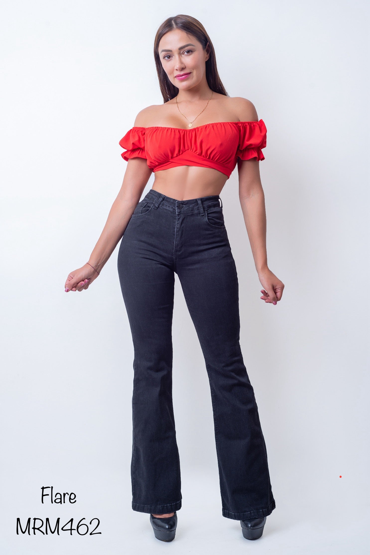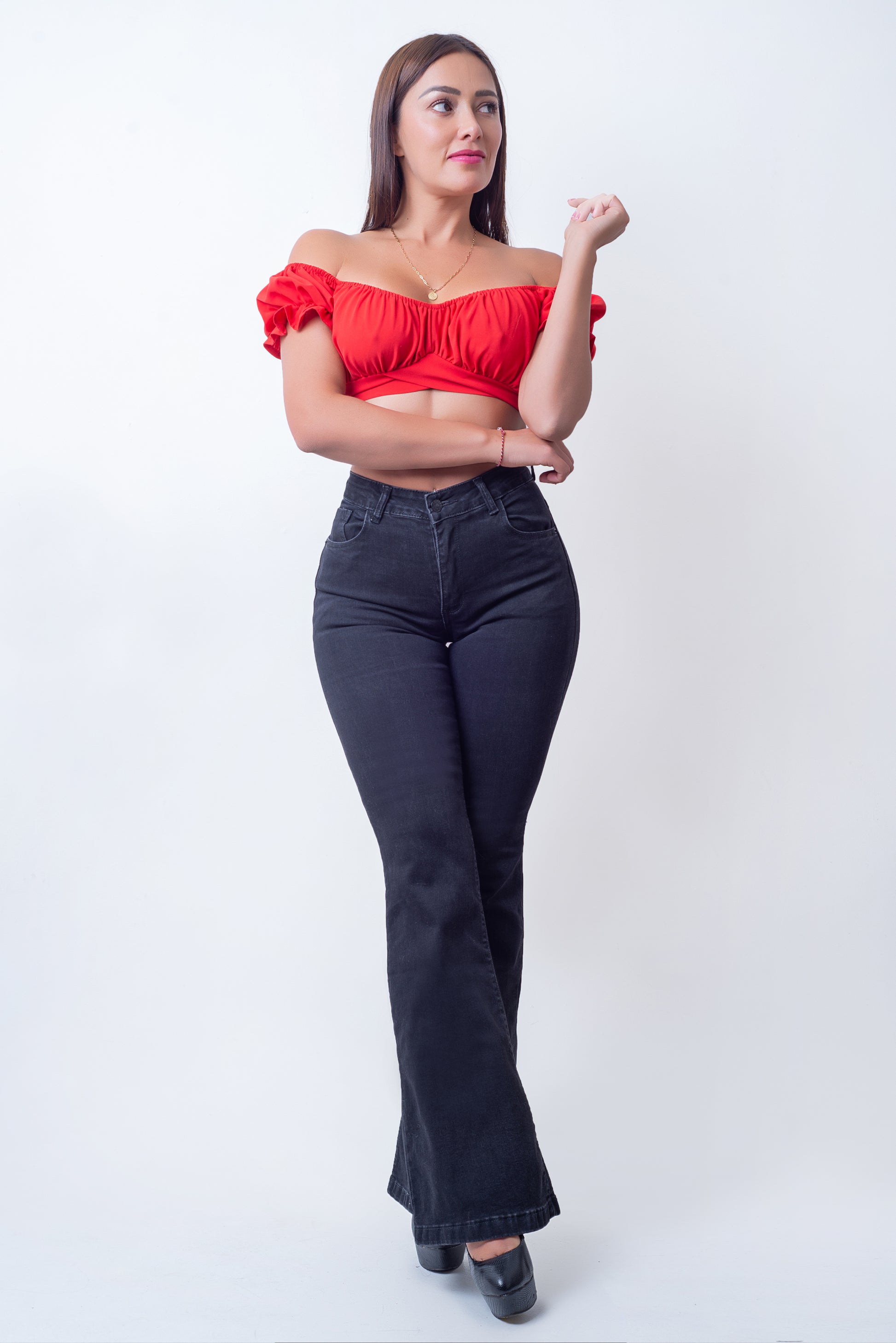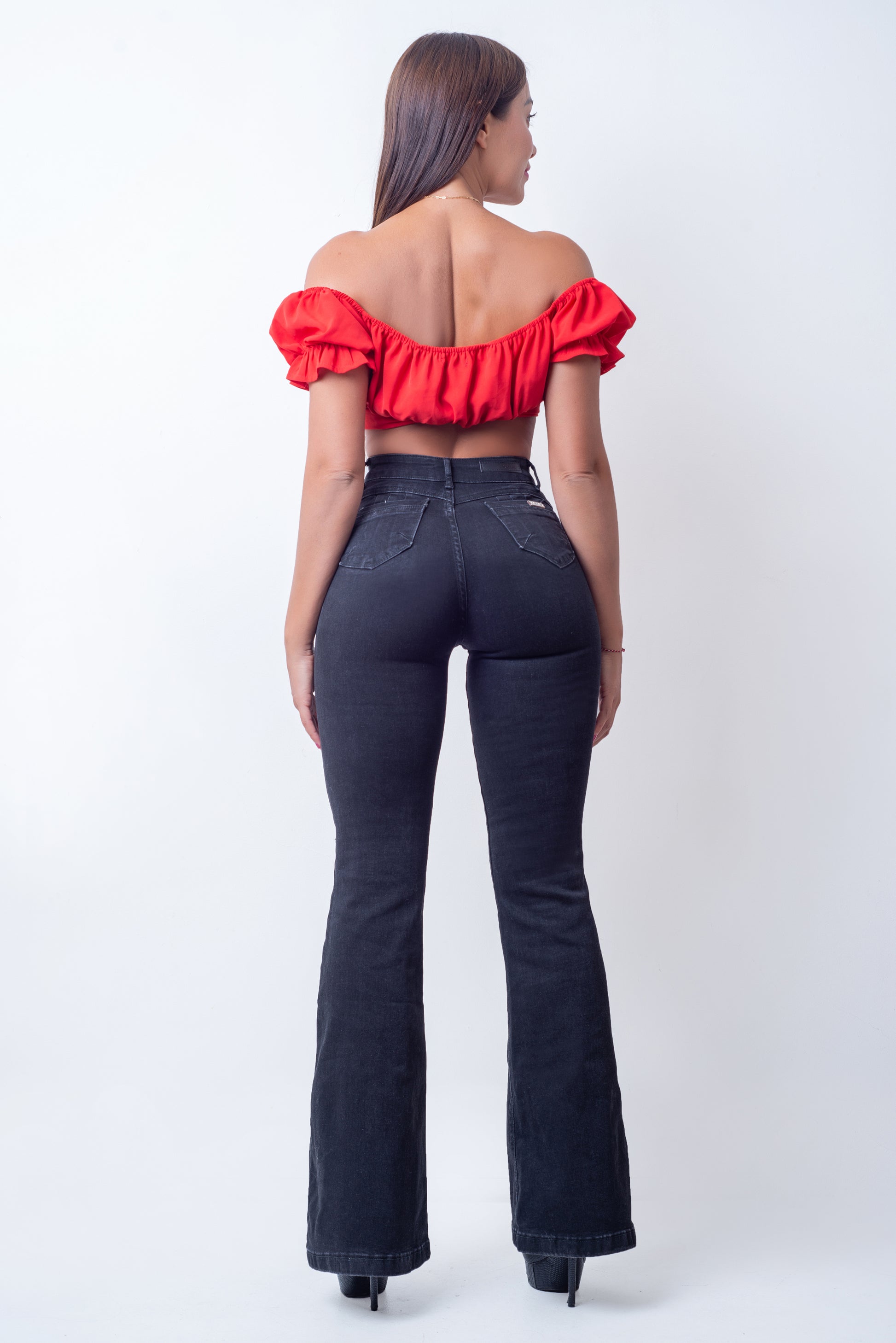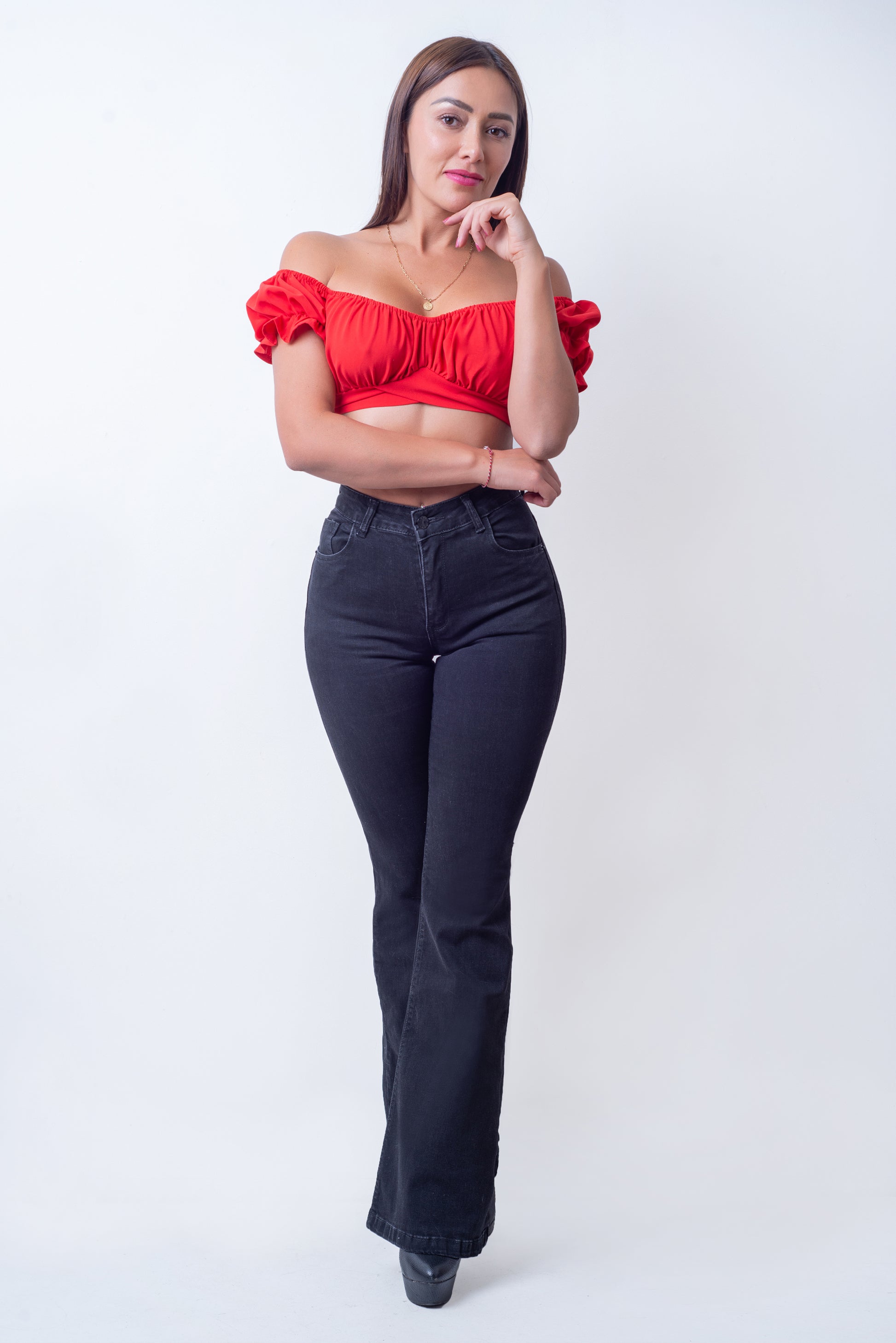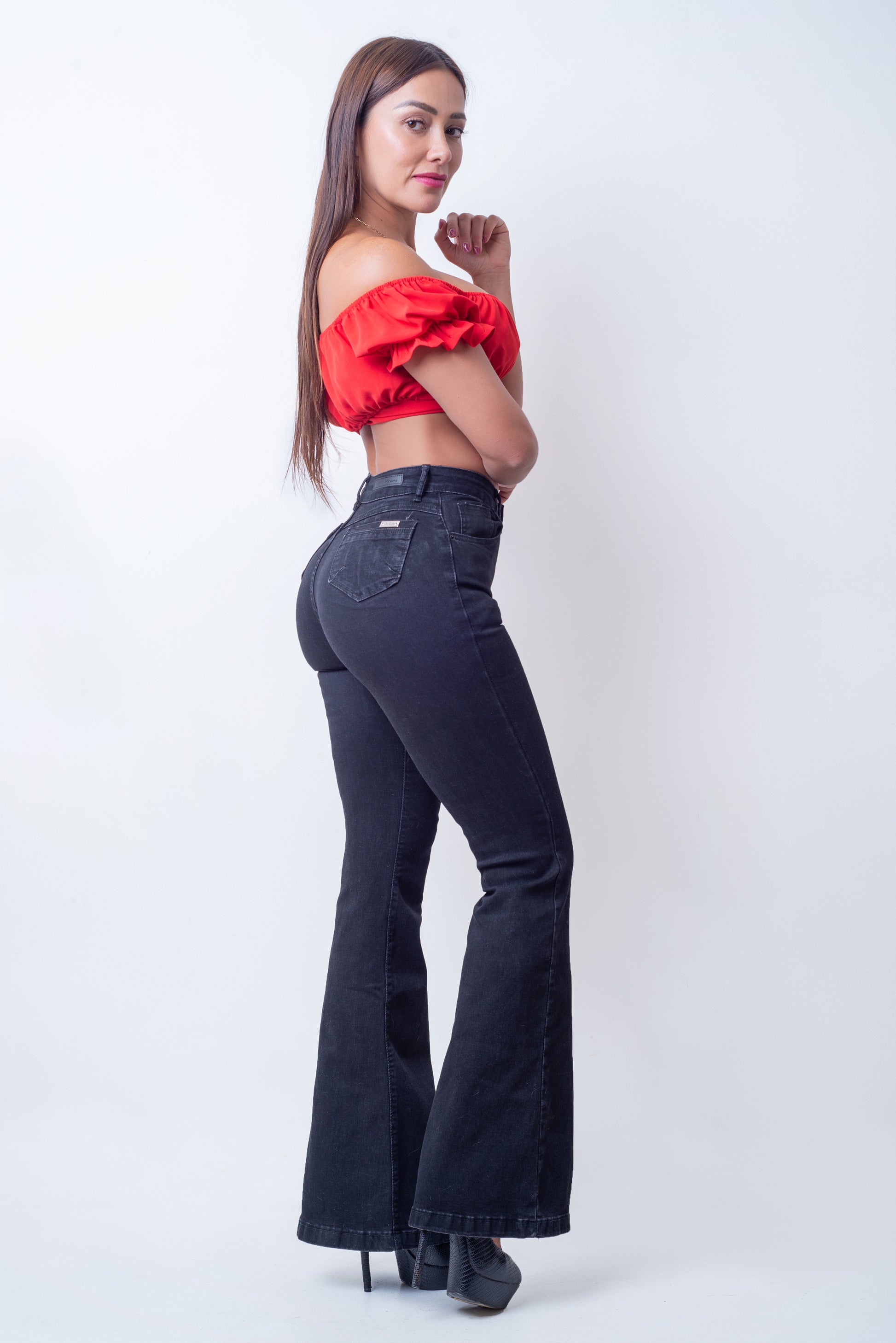 Jeans flare negro push up, mezclilla elasticada, tiro alto. La modelo usa talla 38