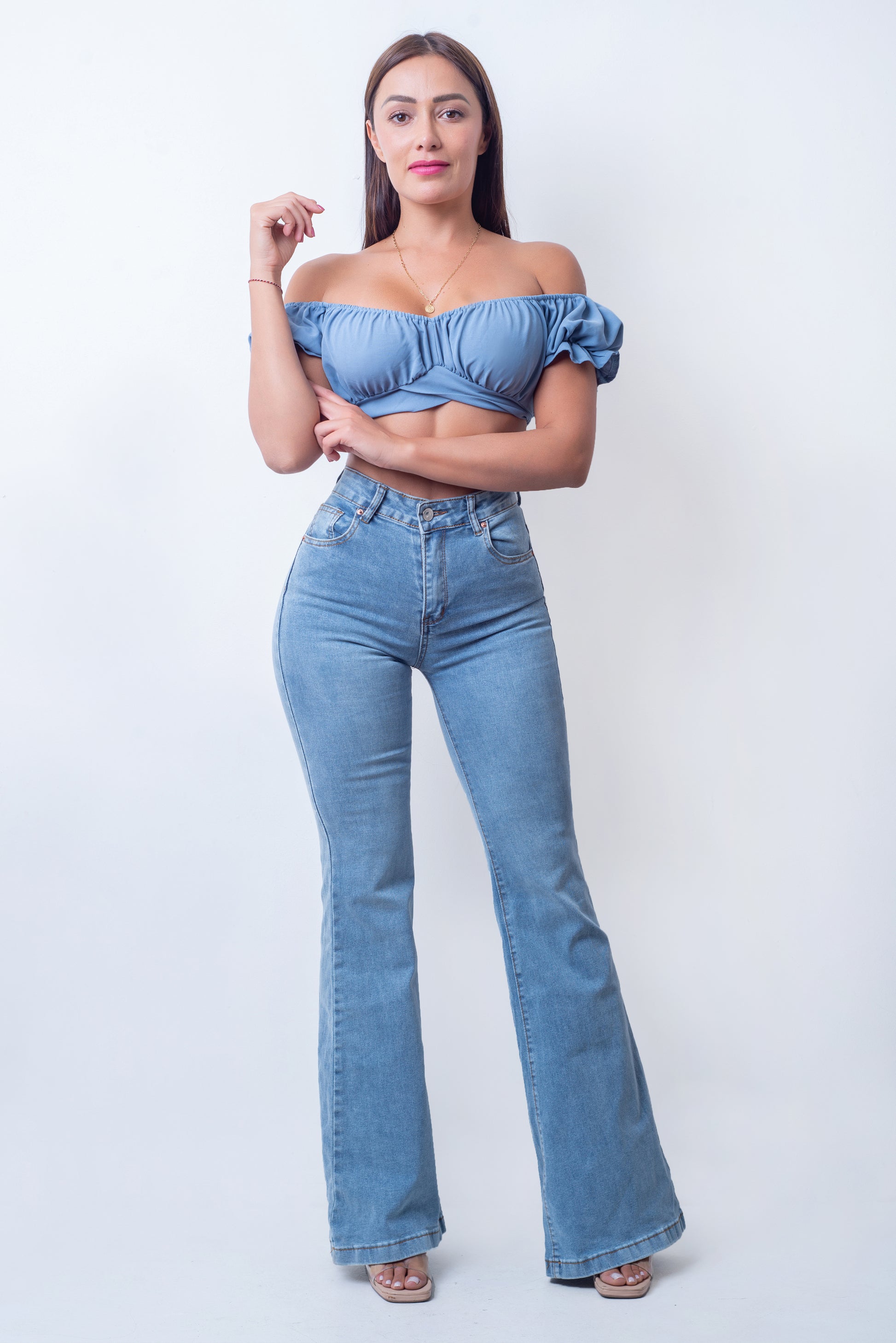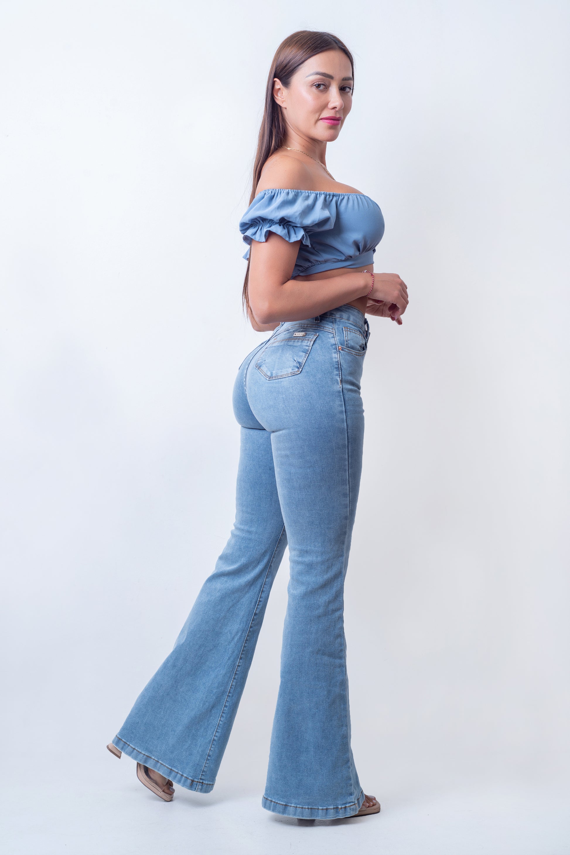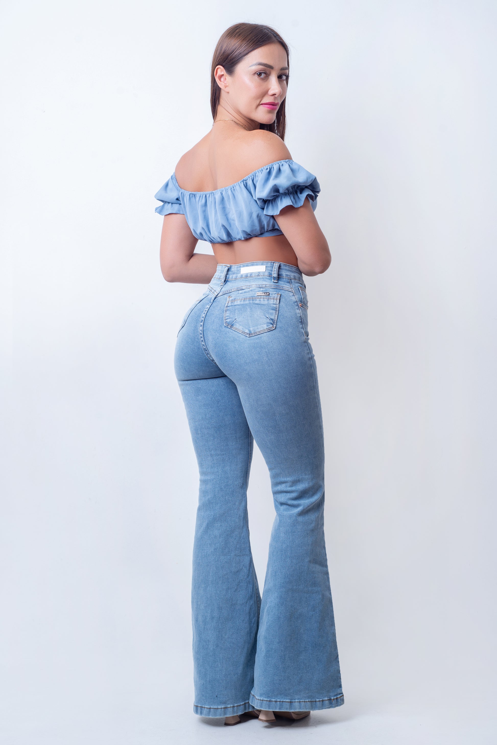 Jeans flare, push up, elasticado, tiro alto. La modelo usa talla 38