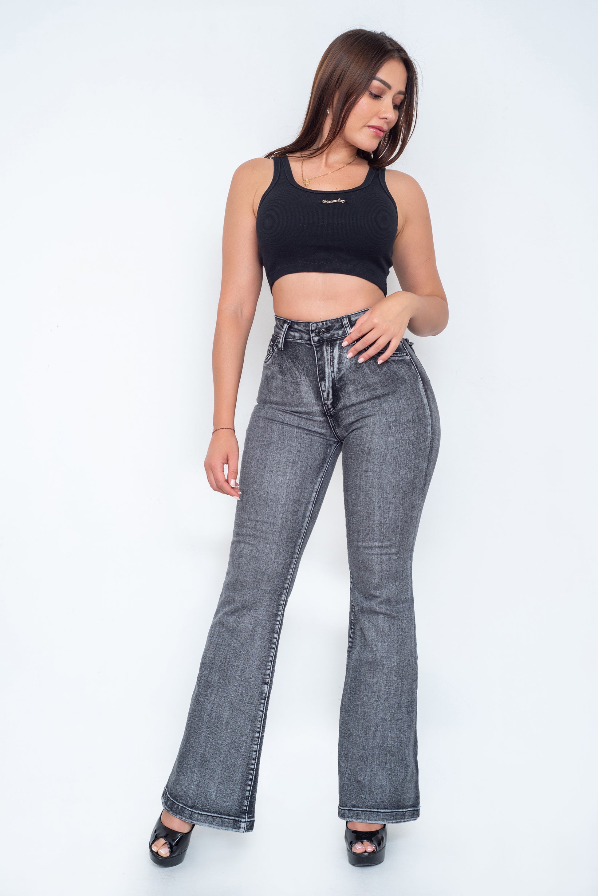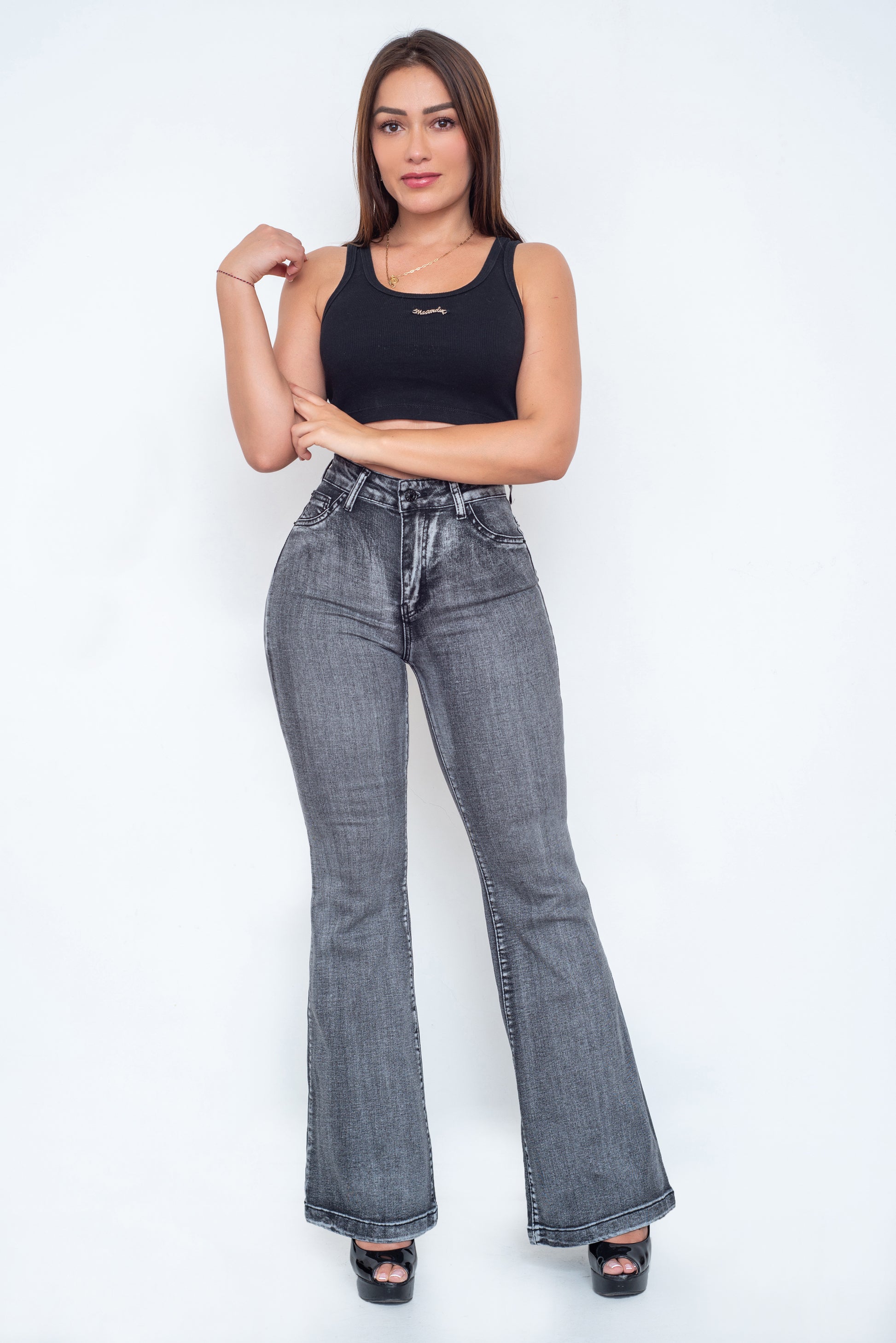 FLARE TAPETA MEZCLILLA ELASTICADA, PUSH UP. LA MODELO USA TALLA 38